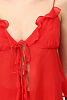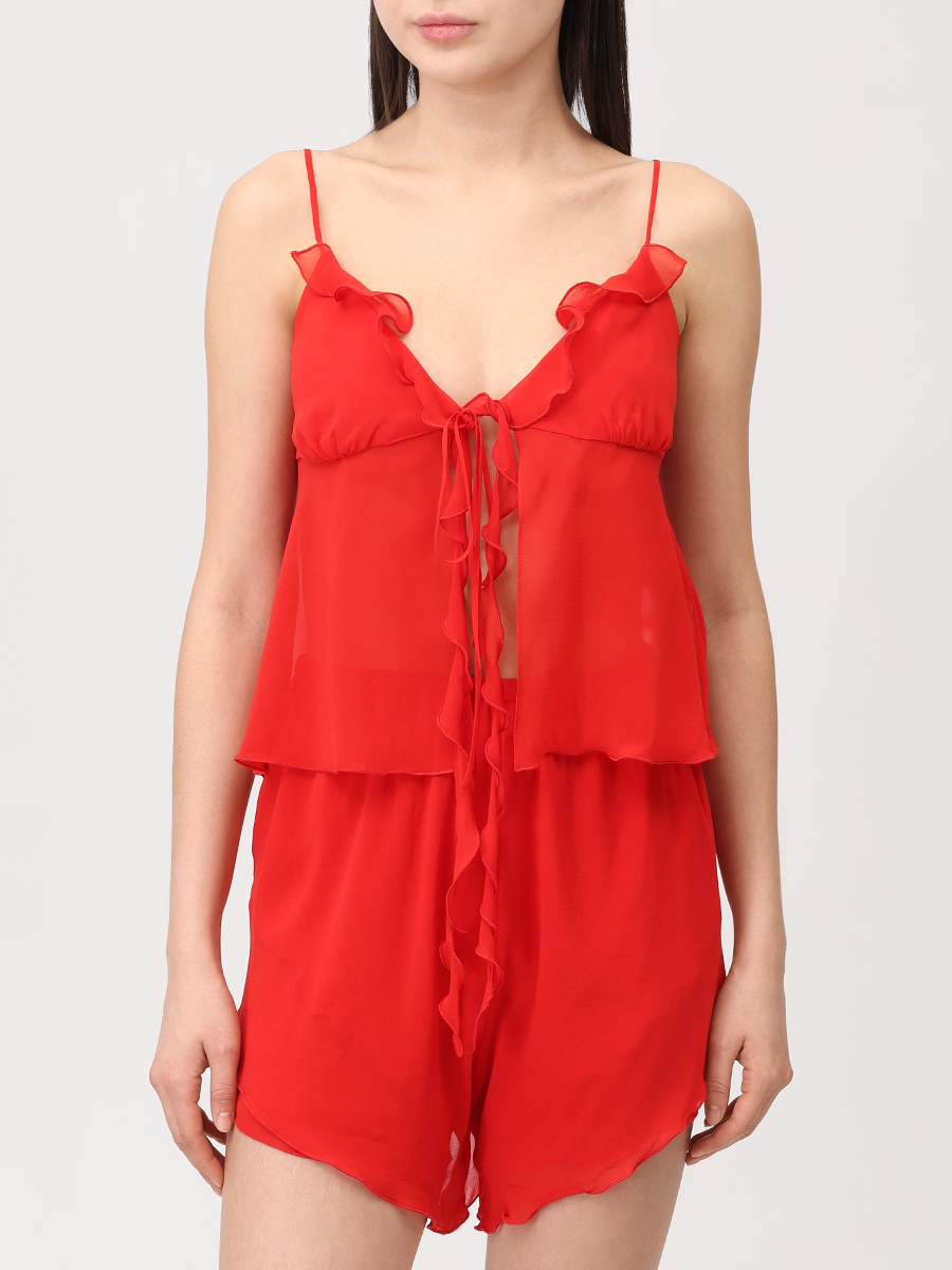 Топ из тончайшего шифонового шелка алого цвета создан для создания самых романтичных и нежных образов. Топ декорирован воланами, завязками из шнурков, что позволяет топу плотно сидеть на груди разного объема (S-M), лямки регулируются по высоте на разный рост. Романтичная стилистика топа позволяет интересного миксовать его как с денимом, там и с шелковыми шортами из шифона.