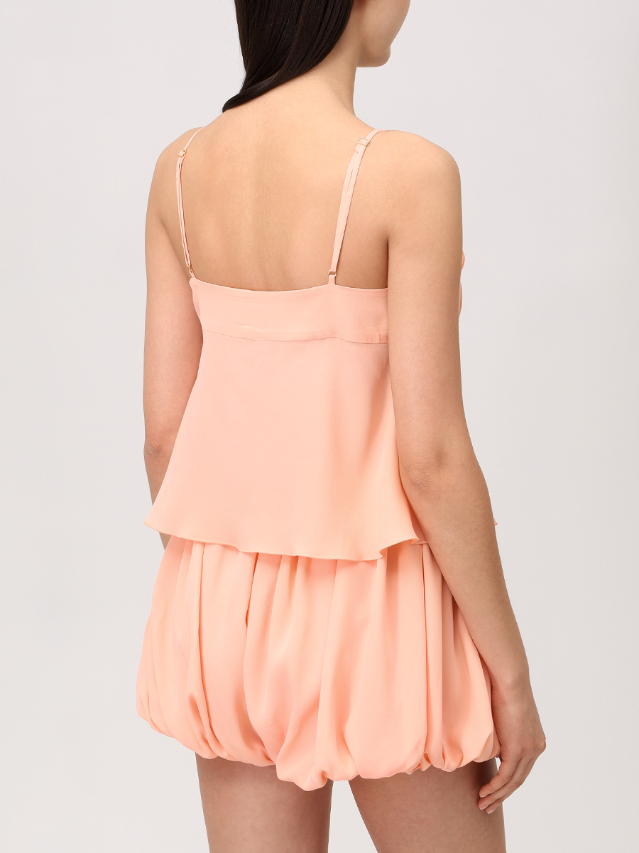 Шорты мини из круизной коллекции Pink bloom созданы из крепового шелка персикового цвета, собранного в равномерную сборку, чтобы придать шортам воздушность и подчеркнуть округлые формы женского тела. За счёт объема и длины мини шорты выглядят игриво и романтично. Шорты застегиваются сзади на молнию и идеально впишутся как в самое изысканное путешествие, так и в гардероб модницы из городских джунглей. Хорошо подумайте прежде купить эти мини шорты и держитесь от мужчин подальше, риск вызвать шквал восторженных вздохов вам вслед и неприлично частых запросов на знакомства в этих шортах многократно увеличиваются.