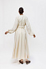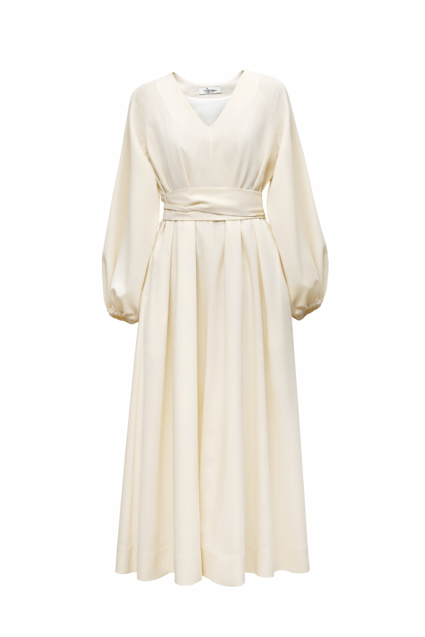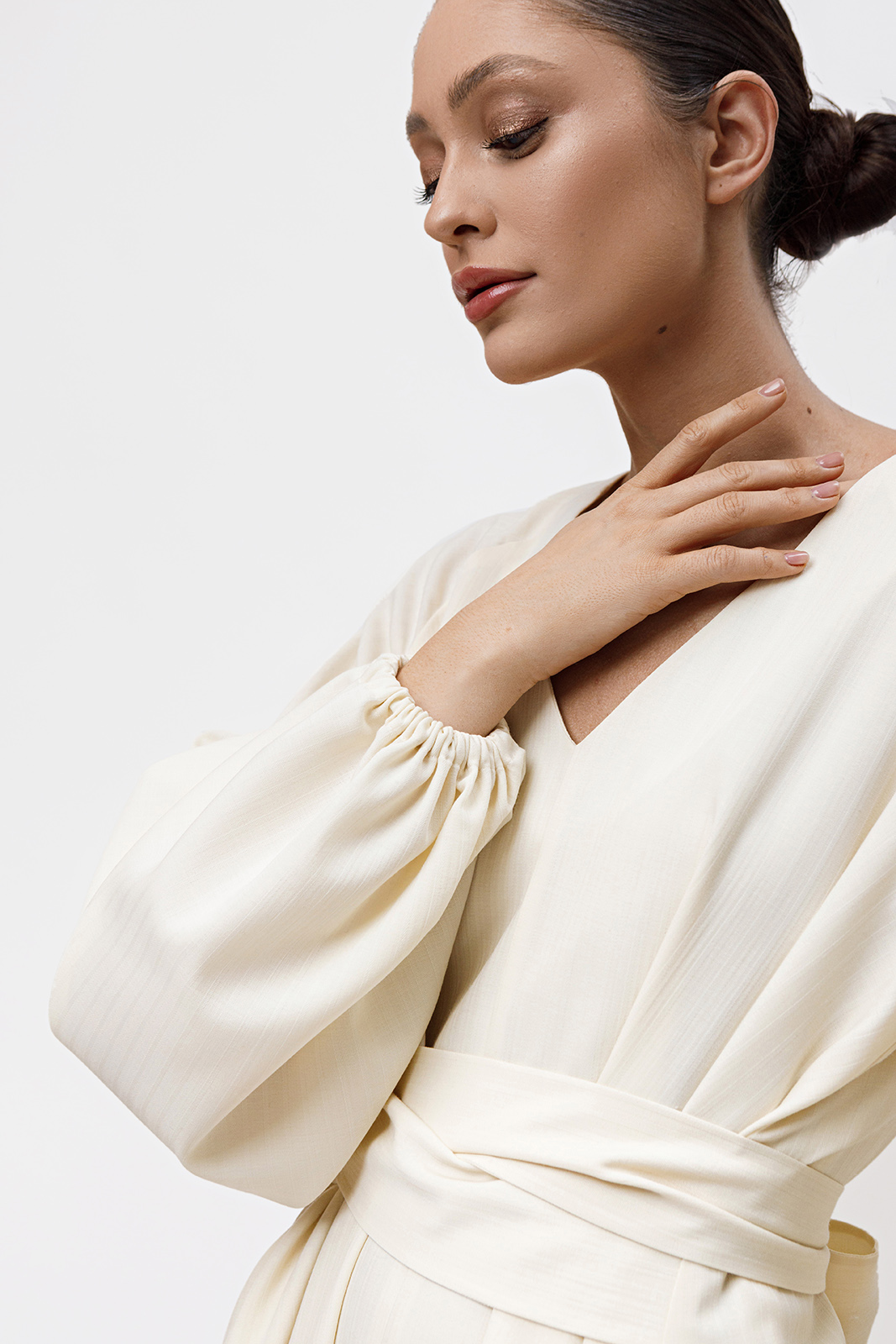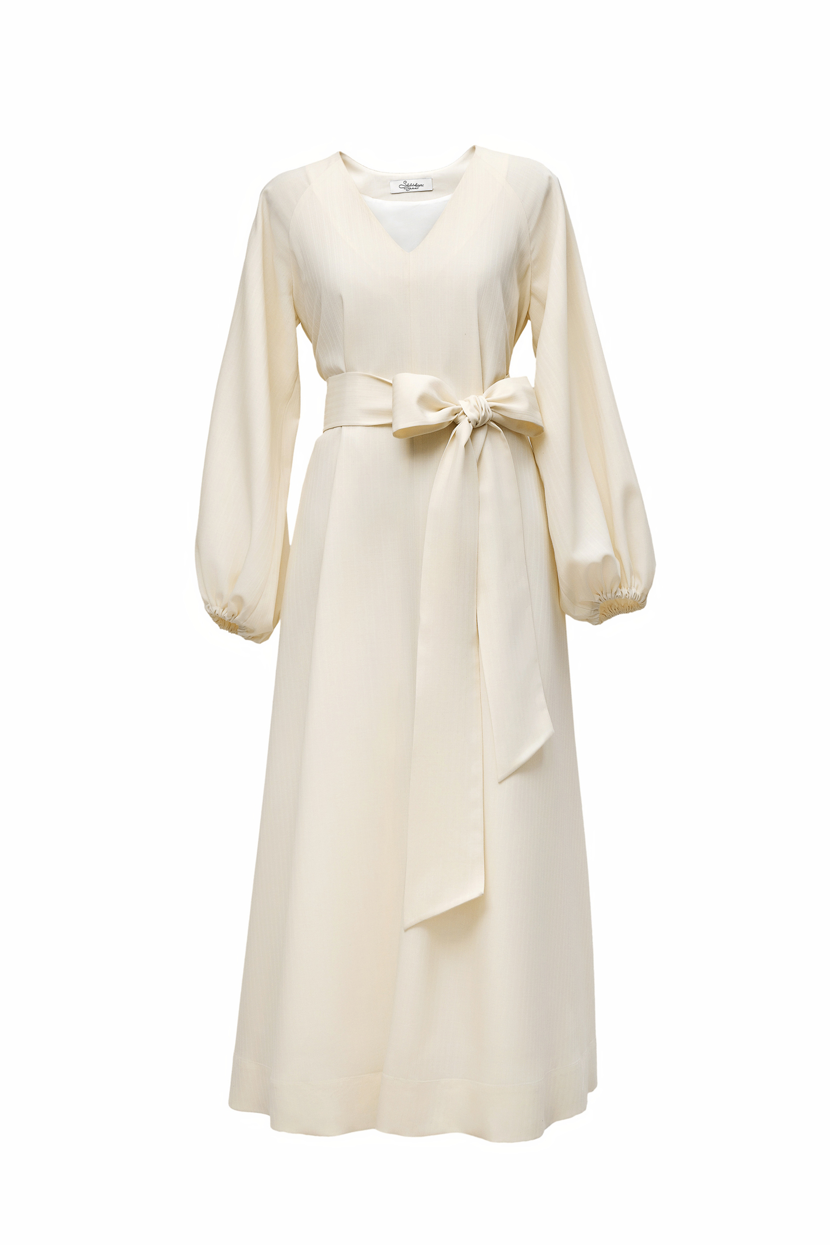 Платье средней длины в сезоне весна 2023. Модель из тонкой плательной шерстяной ткани в выроженную тканую полоску свободного силуэта и длинным втачным поясом в боковые швы, для возможности приталивания и декорирования бантом. В боковых швах для удобства выполнены два кармана. Платье с расширенным длинным рукавом реглан по низу присборенным на резинку. Подклад по полочке и спинке 100% вискоза. По низу изделия высокая подгибка. Изделие выполнено в универсальном размере one size.