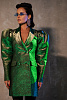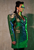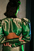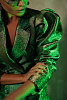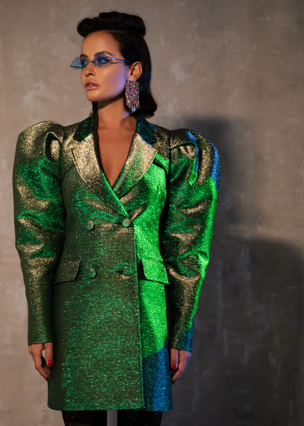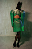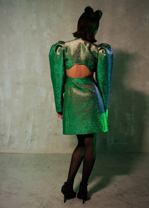 Платье-жакет сложного кроя длиной мини, полуприлегающего силуэта, выполнено из тафты с люрексом зеленого цвета с отливом "хамелеон". Отлетные парные кокетки спереди, английский воротник, застежка на обтяжные пуговицы, классические функциональные прорезные карманы в рамку с клапанами. Втачной длинный увеличенный рукав-фонарик с глубоко-заложенными складками. Открытая средняя часть спинки за счет фигурной отлетной кокетки и декольте по нижней части платья. Отстрочка по воротнику, лацкану и краю борта, по кокеткам, рельефных швам и карманам.