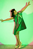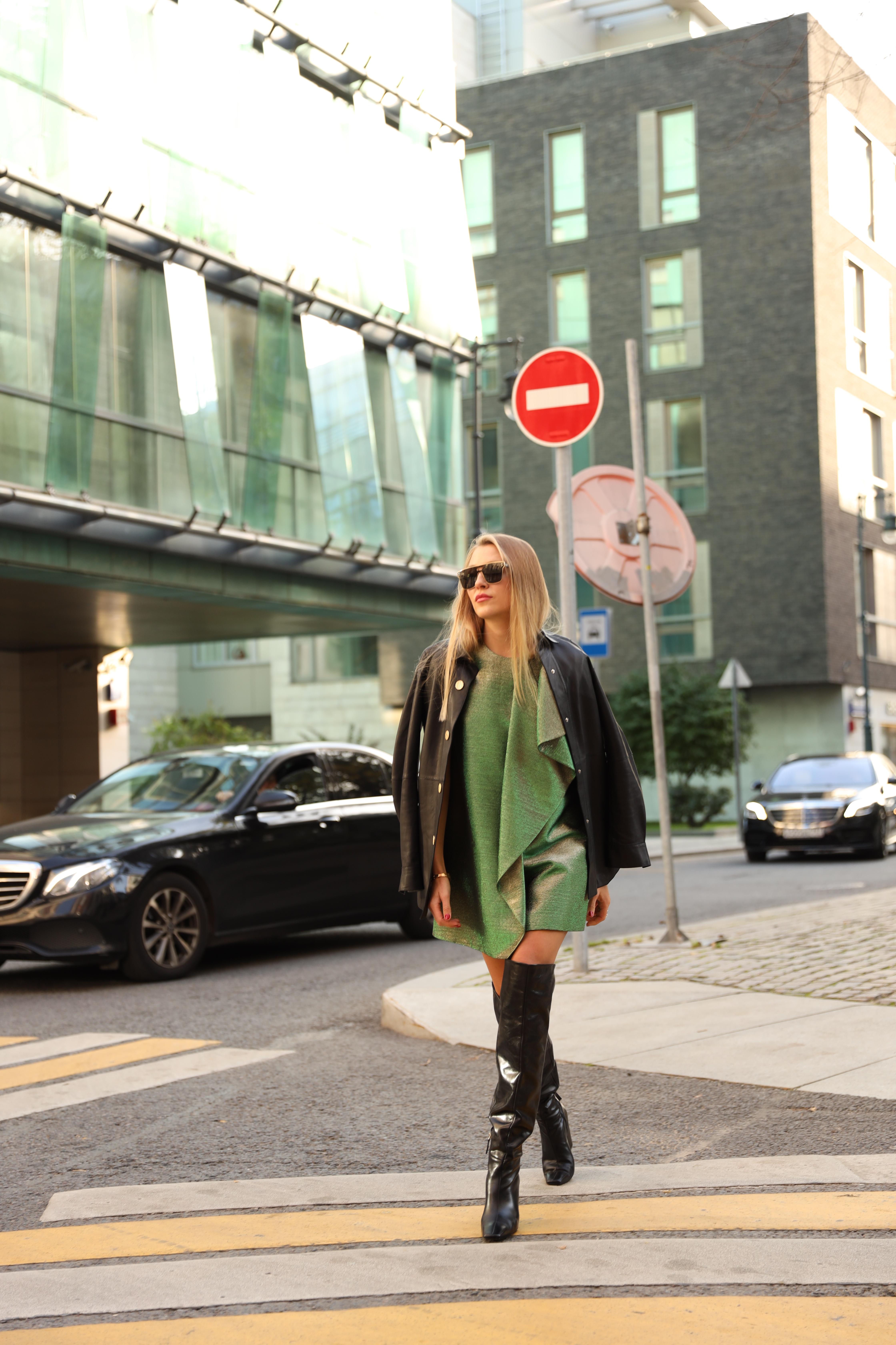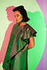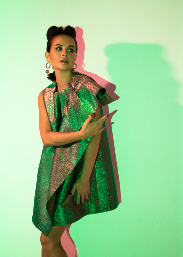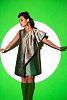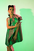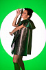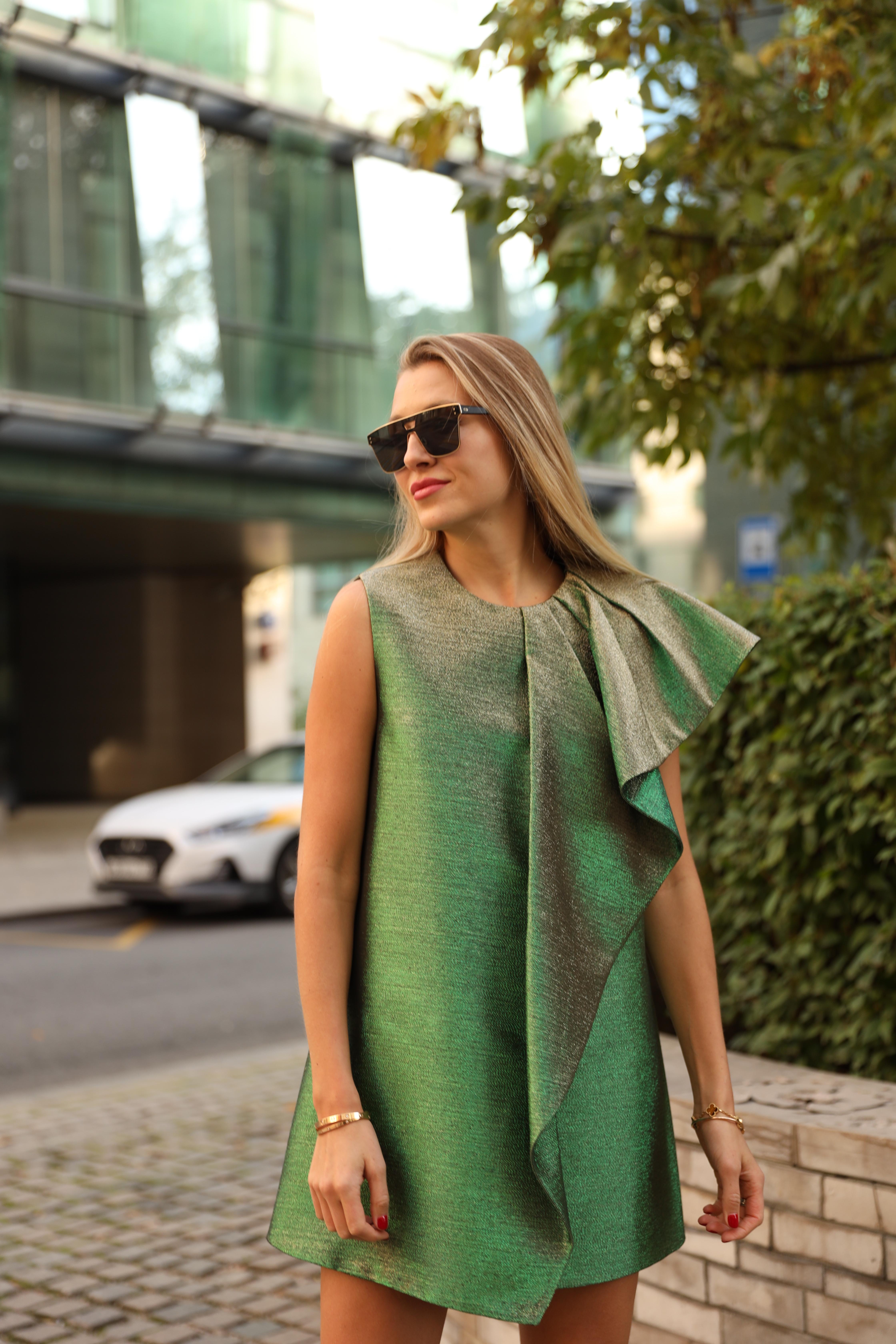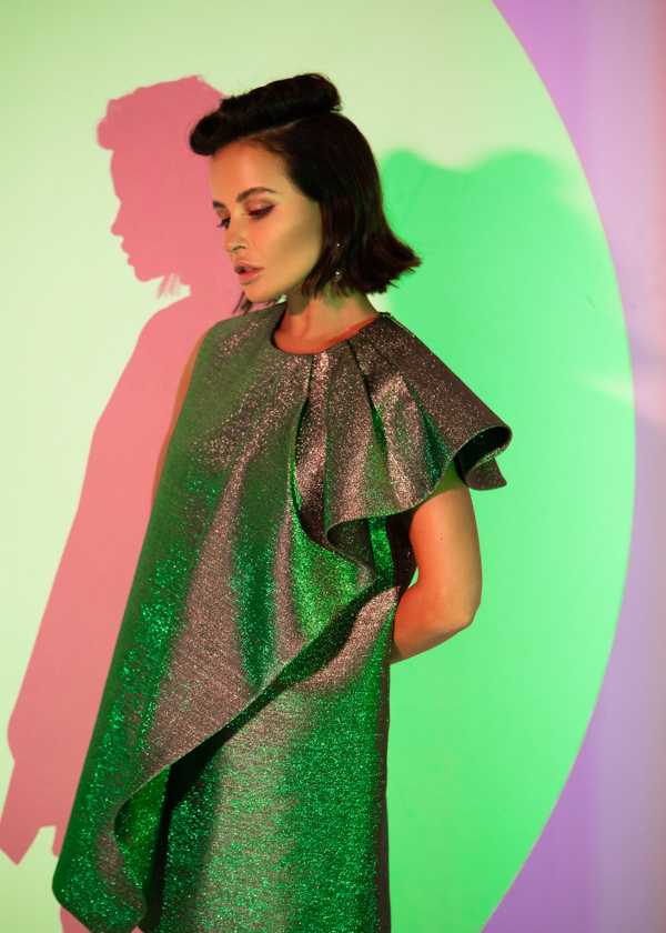 Платье-трапеция длиной мини на подкладке выполнено из тафты с люрексом зеленого цвета с отливом "хамелеон". Спереди платье дополнено накладной драпирующейся асимметричной деталью со складками. Потайная застежка-молния в среднем шве спинки.