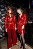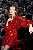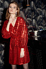 Платье мини из пайеток ярко-красного цвета с лифом на запах, с резинкой на талии. Глубокий вырез V-формы,объемные рукава на резинке по низу. Платье дополнено съемным поясом на талии.