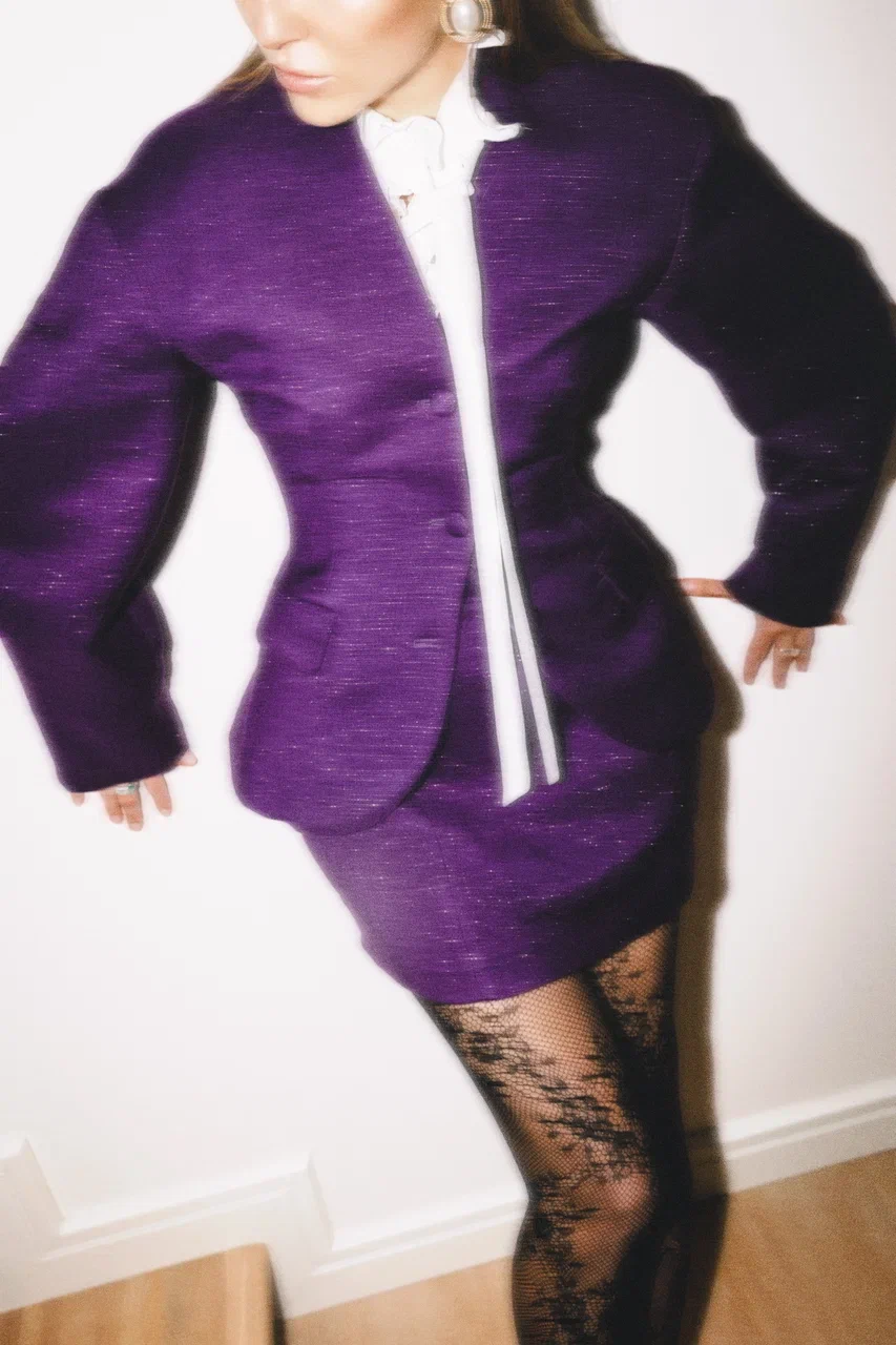Юбка-корсет мини выполнена из шерсти фиолетового цвета с вкраплениями люрекса. Оригинальный вечерний вариант отлично сочетается с шелковой блузкой и жакетом из этой же коллекции. Юбка высоко фиксирует талию подобно корсету, внутри есть отстегивающиеся пушапы-подушечки, которые создают гипертрофированный объем на бедрах. Юбка подойдет на размеры S-M ( от 66-70; об 96-100)