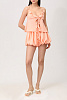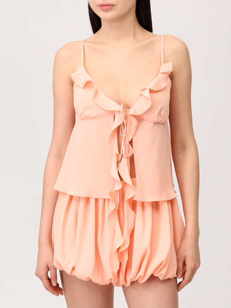 Шорты мини из круизной коллекции Pink bloom созданы из крепового шелка персикового цвета, собранного в равномерную сборку, чтобы придать шортам воздушность и подчеркнуть округлые формы женского тела. За счёт объема и длины мини шорты выглядят игриво и романтично. Шорты застегиваются сзади на молнию и идеально впишутся как в самое изысканное путешествие, так и в гардероб модницы из городских джунглей. Хорошо подумайте прежде купить эти мини шорты и держитесь от мужчин подальше, риск вызвать шквал восторженных вздохов вам вслед и неприлично частых запросов на знакомства в этих шортах многократно увеличиваются.