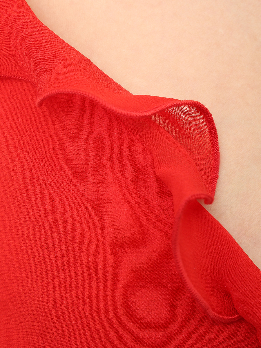 Топ из тончайшего шифонового шелка алого цвета создан для создания самых романтичных и нежных образов. Топ декорирован воланами, завязками из шнурков, что позволяет топу плотно сидеть на груди разного объема (S-M), лямки регулируются по высоте на разный рост. Романтичная стилистика топа позволяет интересного миксовать его как с денимом, там и с шелковыми шортами из шифона.