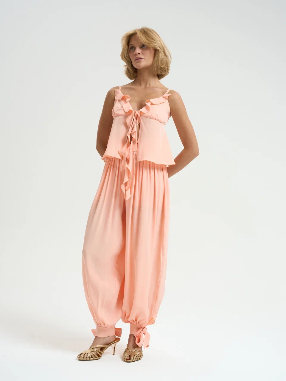 Топ шелковый с воланами на завязках персикового цвета